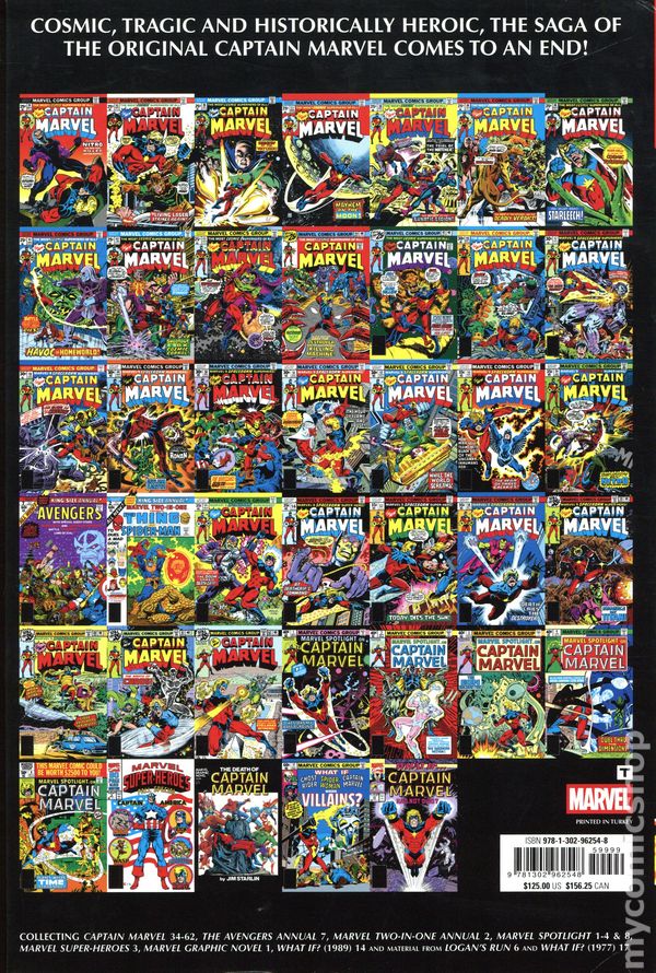 1st printing. Collects Captain Marvel (1968-1979 1st Series Marvel) #34-62, Marvel Spotlight (1979-1981 2nd Series) #1-4 and 8, The Avengers (1963-1996 1st Series) Annual #7, Marvel Two-in-One (1974-1983 1st Series) Annual #2 and The Death of Captain Marvel GN (1982 Marvel Graphic Novel), and material from Marvel Super Heroes (1990-1993 2nd Series) #3, What If (1977-1984 1st Series) #17 and What If (1989 2nd Series) #14. Written by Jim Starlin, Steve Englehart, Al Milgrom, Scott Edelman, Doug Moench, Mike Friedrich, Chris Claremont, Gerry Conway, Bill Mantlo, Jim Shooter, Roger McKenzie, Marv Wolfman, Archie Goodwin, Mike Barr, Dick Riley, Peter B. Gillis, Diverse Hands, Steven Grant, Steve C. Ringgenberg, and Matt Jorgensen. Art by Jim Starlin, Al Milgrom, Pat Broderick, Alfredo Alcala, Mike Zeck, George Tuska, Dave Cockrum, Steve Ditko, Frank Miller, Jerry Bingham, Carmine Infantino, Matt Jorgensen, Jack Abel, Alfredo Alcala, Alan Weiss, Klaus Janson, Al McWilliams, Bernie Wrightson, P. Craig Russell, Bob McLeod, Terry Austin, Frank Giacoia, Mike Esposito, Bob Wiacek, Joe Rubinstein, Bruce Patterson, Gene Day, Chic Stone, Pablo Marcos, Ian Akin, and Brian Garvey. Cover by Jeff Aclin and Bob McLeod. Completing the original adventures of the first Captain Marvel! Welcome to the next level of cosmic consciousness with the adventures of Captain Marvel! From Earth to the Moon to the Watcher's homeworld and into the Negative Zone, these galaxy-spanning stories set the tone for Marvel epics. Bonded to Rick Jones by the Nega-Bands, Captain Marvel defends his adopted planet against the Kree and their mad quest for genetic superiority and galactic empire. Then, in a deadly plan set in motion by Thanos' death, the massive computer I.S.A.A.C. takes over an entire world! This once-in-a-lifetime Omnibus also features massive battles with Drax the Destroyer, the bizarre Lunatic Legion and, of course, Jim Starlin's legendary graphic novel, "The Death of Captain Marvel." Hardcover, 8 1/2-in. x 11-in., 920 pages, full color. Rated T Cover price $125.00.