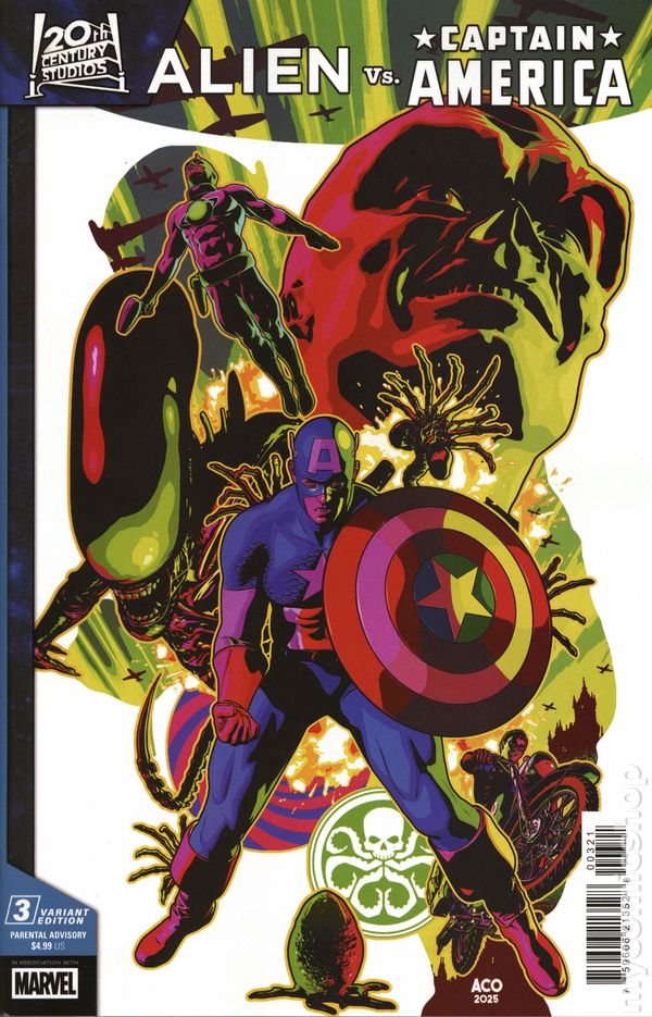 Limited 1 for 25 Retailer Incentive Variant Cover.(W) Frank Tieri (A) Stefano Raffaele (CA) Davide Paratore ALLIED, AXIS AND ALIEN POWERS COLLIDE! CAPTAIN AMERICA leads BUCKY BARNES and the rest of the HOWLING COMMANDOS behind enemy lines in order to free one of their own - but no-one is prepared for the horror they discover at HYDRA'S most top-secret base! Meanwhile, has RED SKULL managed to find a way to harness the destructive might of the XENOMORPHS, or has he merely added to the carnage and chaos of the warfront? Either way, Captain America and his allies are about to face their biggest fight yet - that is, unless an unexpected "alien" ally sees fit to intervene! RATED PARENTAL ADVISORY. Cover price $4.99.