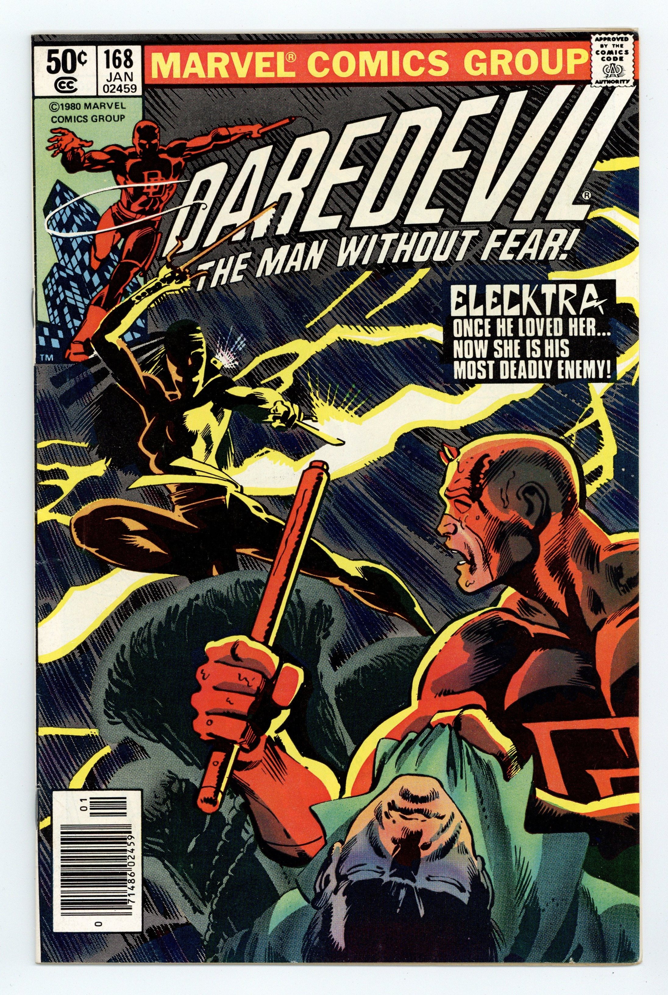 Starts May 4 Cover pencils by Ross Andru, inks by Frank Giacoia. Death Stalks the City!, script by Steve Gerber, pencils by Bob Brown, inks by Vince Colletta; DD rescues Candice and Foggy from Death-Stalker but the villain escapes; DD combs the local chemical plants searching for Death-Stalker and, once he discovers him, ends up knocking him into a vat of hydrochloric acid; Black Widow guest appearance; cameos by the Gladiator and Man-Thing. The letters page contains Marvel Value Stamp series A #35 (Killraven by Herb Trimpe), and also an ad for Wolverine's debut in Incredible Hulk #181. 36 pgs. Cover price $0.25. Cover price $0.25.