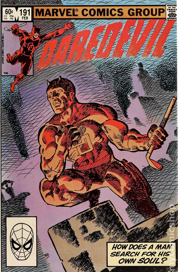 Newsstand Edition. Cover pencils by Frank Miller, inks by Klaus Janson. Child's Play, script by Roger McKenzie and Frank Miller, pencils by Frank Miller (breakdowns) and Klaus Janson (finished art), inks by Klaus Janson; A young girl on drugs takes a dive out of her school window and dies, and her brother, DD and the Punisher are all trying to track down the dealer responsible; Matt proposes to Heather; Hogman [Peter Grunter] is the guest villain. The last few pages are probably penciled by Janson from Miller breakdowns. This story was originally scheduled for issue 167 but delayed because the Comics Code did not approve it in its original form. 36 pgs. Cover price $0.60. Cover price $0.60.