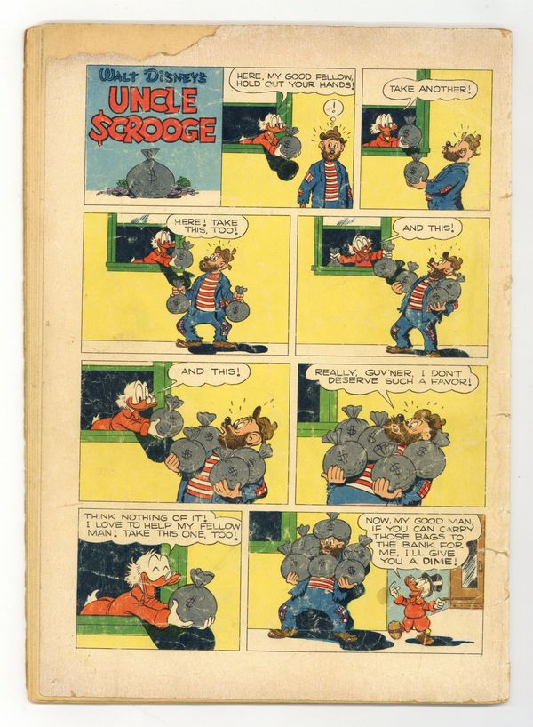 Starts Feb 23 No ads in book. Entire issue from cover to cover is comic stories and one page strips. Uncle Scrooge in an untitled book-length story in which Scrooge, Donald, and the nephews try to transport Scrooge's fortune to a private island for safekeeping. The Beagle Boys strike, however help is available on the island from the "Menehunes," elf-like creatures who are visible when they don't know anyone is looking. Story by Carl Barks. 36 pages, full color. Cover price $0.10.