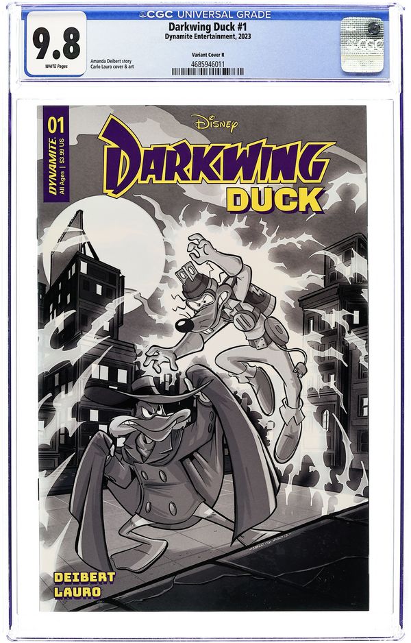 Unknown Comics Megacon Exclusive B&W Sketch Edition Virgin Cover by Marco Mastrazzo. Written by Amanda Deibert. Art by Carlo Lauro. He is the terror that flaps in the night…He is the ferocious fowl who plucks the evil eye from the face of foul play…He is Darkwing Duck! Alongside his trusty sidekick Lauchpad McQuack, Darkwing hyper-vigilantly defends St. Canard from the dastardly, devilish demons who would wage wanton war! By night, our caped defender lurks in the shadows, striking fear (and maybe confusion?) in the heart of the criminal underworld…but by day, no one suspects that Darkwing is also mild-mannered Drake Mallard, a well-meaning father to his adorable adopted daughter, Gosalyn! Can Darkwing successfully navigate his two separate lives, all while looking incredibly cool and impossibly handsome? (Hint: Probably not, but…) You'll have to read to find out! 32 pages, full color.