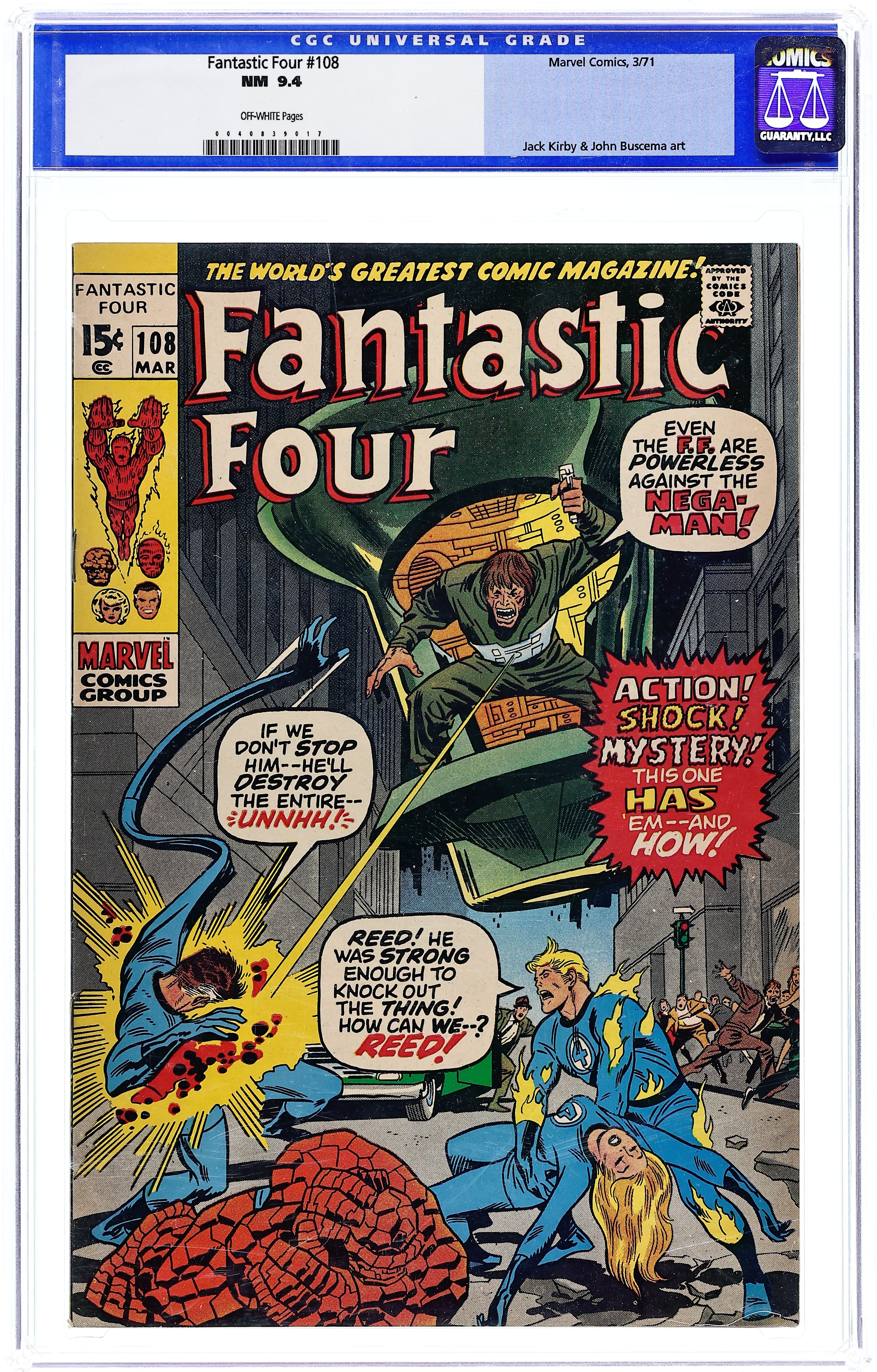 "The Strength of the Sub-Mariner" Part 1 of 3. Guest-starring the Sub-Mariner. Script by Stan Lee. Pencils by Jack Kirby. Inks by Joe Sinnott. Cover by John Romita and John Verpoorten. Prince Namor travels to Antarctica to explore a mysterious subsea shockwave! The Sub-Mariner's investigation leads to the Savage Land and an unconscious man lying on the ground. Who is this gentleman? Readers of the X-Men would know...but unfortunately the Avenging Son does not! Once the Atlanteans take the Master of Magnetism back to Atlantis, he begins to encourage Namor to attack the surface world. Will the Sub-Mariner fall for Magneto's ploy? Regrettably, the Fantastic Four make the choice easy for Namor, when the Thing accidentally fires a missile at Atlantis! Cameo appearance by Franklin. (Notes: Magneto previously appeared in Uncanny X-men 63. This is Magneto's first appearance after the X-Men series went into reprint in the early 1970's. This is also Jack Kirby's final issue as the regular penciler on the Fantastic Four series. Jack Kirby pencils part of issue 108.) 36 pages Cover price $0.15.