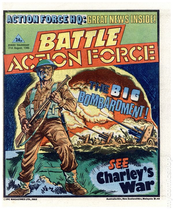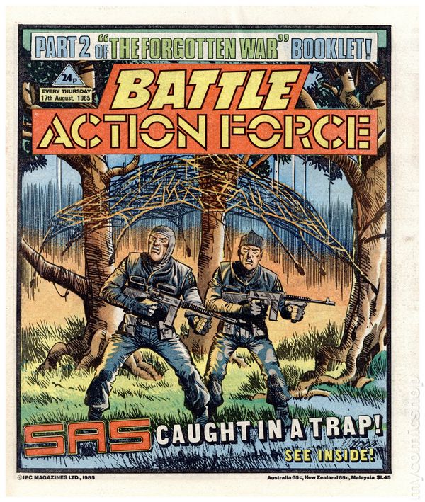 August 3, 1985. Published by IPC Magazines, Ltd. in the U.K. "Tough action war stories every week!" Combined with Valiant (also an IPC publication). 9 x 11 in.; black and white (color centerspread); 32 pages; 24p cover price.