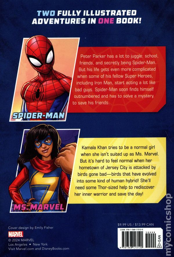 1st printing. Written by Rich Thomas, Jr. and Calliope Glassd Art by Ron Lim, Lee Duhig, and Caravan Studios. Two stand-alone, fully illustrated, full-color stories bound up to create one action-packed book! Peter Parker has a lot to juggle: school, friends, and secretly being Spider-Man. But his life gets even more complicated when some of his fellow Super Heroes, including Iron Man, start acting a lot like bad guys. Spider-Man soon finds himself outnumbered. Kamala Khan tries to be a normal girl when she isn't suited up as Ms. Marvel. But it's hard to feel normal when her hometown of Jersey City is attacked by birds gone bad-birds that have evolved into some kind of human hybrid! She'll need some Thor-sized help to rediscover her inner warrior and save the day! Softcover, 5-in. x 7 1/2-in., 256 pages, full color. All Ages Cover price $9.99.