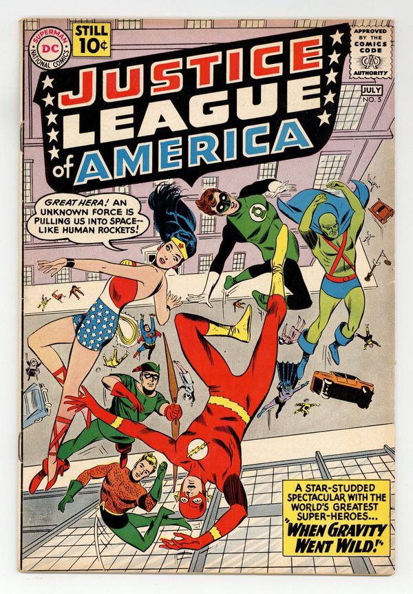 Starts Apr 4 Cover pencils by Mike Sekowsky, inks by Bernard Sachs. When Gravity Went Wild!, script by Gardner Fox, pencils by Mike Sekowsky, inks by Bernard Sachs; Green Arrow is put on trial for helping the enemies of the Justice League escape from capture. 36 pgs. $0.10. Cover price $0.10.