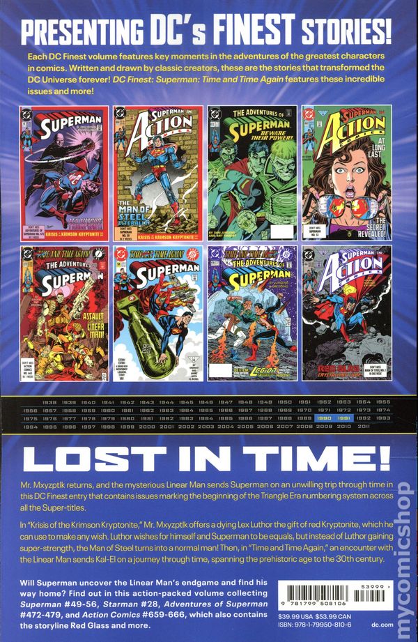 1st printing. Collects Superman (1987-2011 2nd Series) #49-56, Starman (1988-1992 1st Series) #28, The Adventures of Superman (1987-2006) #472-479, and Action Comics (1938-2011 DC) #659-666. Written by Jerry Ordway, James D. Hudnall, Roger Stern, and Dan Jurgens. Art by Jerry Ordway, Dennis Janke, Dan Jurgens, Brett Breeding, Kerry Gammill, Curt Swan, John Byrne, Ed Hannigan, Willie Blyberg, Dave Hoover, Scott Hanna, Art Thibert, and Bob McLeod. Cover by Kerry Gammill and Dennis Janke. LOST IN TIME! Mr. Mxyzptlk returns, and the mysterious Linear Man sends Superman on an unwilling trip through time in this DC Finest entry that contains issues marking the beginning of the Triangle Era numbering system across all the Super-Titles. In Krisis of the Krimson Kryptonite, Mr. Mxyzptlk offers a dying Lex Luthor the gift of red Kryptonite, which he can use to make any wish. Luthor wishes for himself and Superman to be equals, but instead of Luthor gaining super-strength, the Man of Steel turns into a normal man! Then, in Time and Time Again, an encounter with Linear Man sends Kal-El on a journey through time, spanning the prehistoric age to the 30th century. Will Superman uncover the Linear Mans endgame and find his way home? Find out in this action-packed volume! Softcover, 6-in. x 9-in., 600 pages, full color. Teen Cover price $39.99.
