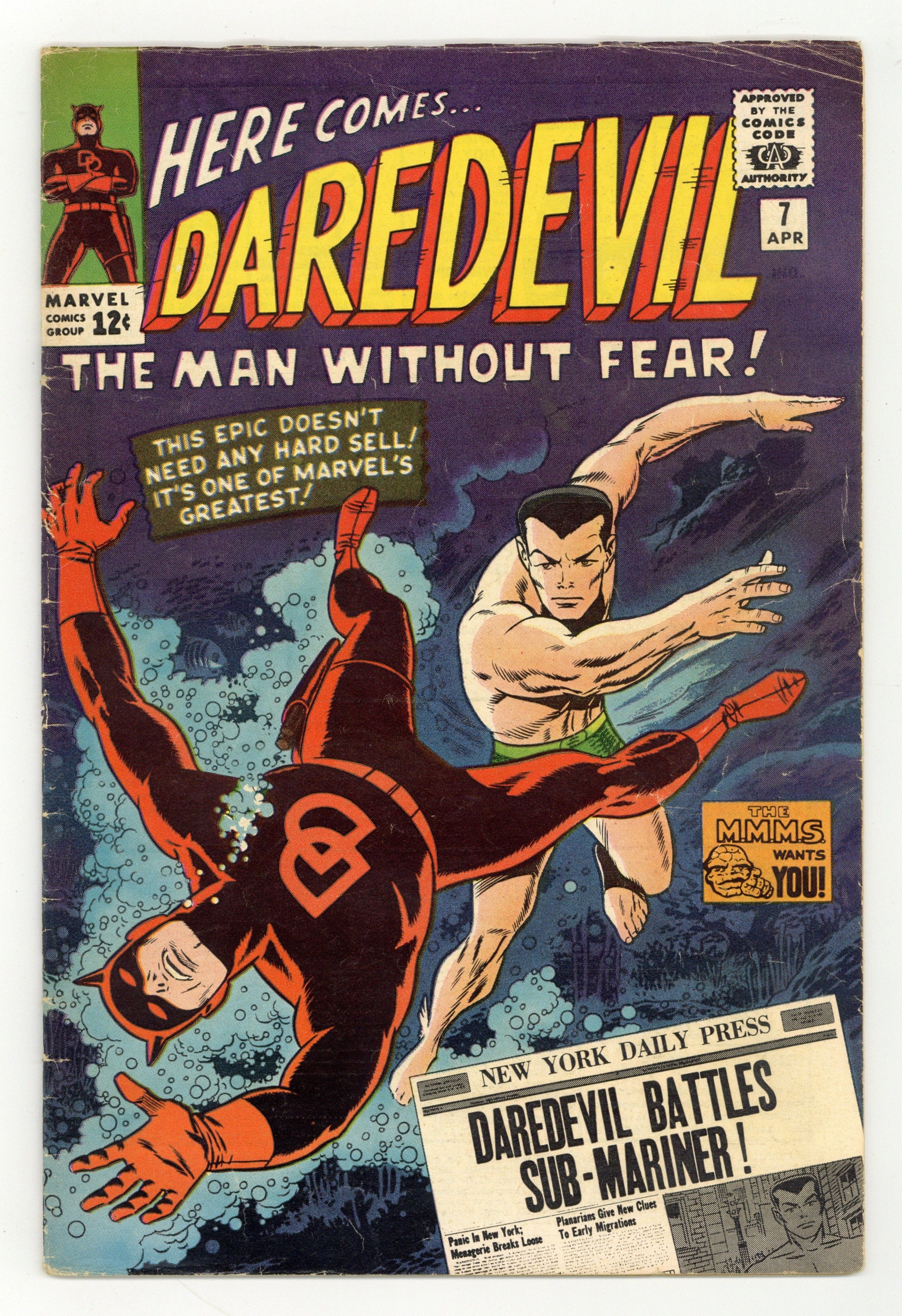 Starts Feb 23 "In Mortal Combat with Sub-Mariner!" Written by Stan Lee. Art and cover by Wally Wood. Namor hires Franklin and Murdock to sue the human race on his behalf. When this doesn't work, he gets himself arrested so he can have his day in court. Realizing humanity won't listen, the Sub-Mariner goes on a rampage which brings Daredevil into the (hopeless) fray. Namor returns to the sea out of respect for DD and to stop Krang from taking over Atlantis. Sub-Mariner/Daredevil pin-up by Wood. Note: First appearance of Daredevil's red costume. 36 pages, full color. Cover price $0.12.