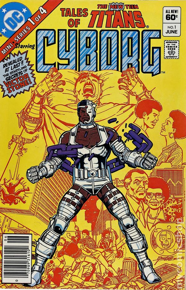 Newsstand Edition. Script by Marv Wolfman, pencils by George Perez, embellishes by Brett Breeding. Cyborg pin-up by Perez. Cover by Perez. Victor Stone tells the other Titans about his past, relating his animosity towards his father, running with the wrong crowd, and the events that turned him into "Cyborg." 25-page tale. Appearances by Robin, Wonder Girl, Kid Flash, Starfire, Changeling, Raven. Cover price $0.60.