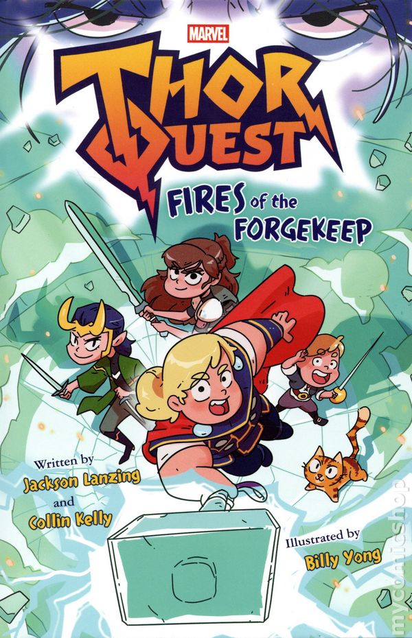 Volume 2 - 1st printing. "Fires of the Forgekeep!" Written by Jackson Lanzing and Collin Kelly. Art and cover by Billy Yong. Thor, mighty thunder god. Loki, trickster without equal. But before they were heroes, they were kids, and like all kids, they got into trouble. Along with Sif, trained to be a warrior from birth, and Fandral, Thor's best friend, they got into a lot of trouble. Now they're scattered, on the run from a furious Dwarf Lord, and trapped in an underground labyrinth. Is their Thor Quest... a failure? Maybe not, thanks to the power of a magic hammer, some Loki-style trickery, and, y'know, friendship. Filled with art, comics panels, and wild and hilarious twists, this second volume in the new Thor Quest series will keep you flipping its pages and laughing out loud. Hardcover, 5-in. x 8-in., 208 pages, full color. All Ages Cover price $14.99.