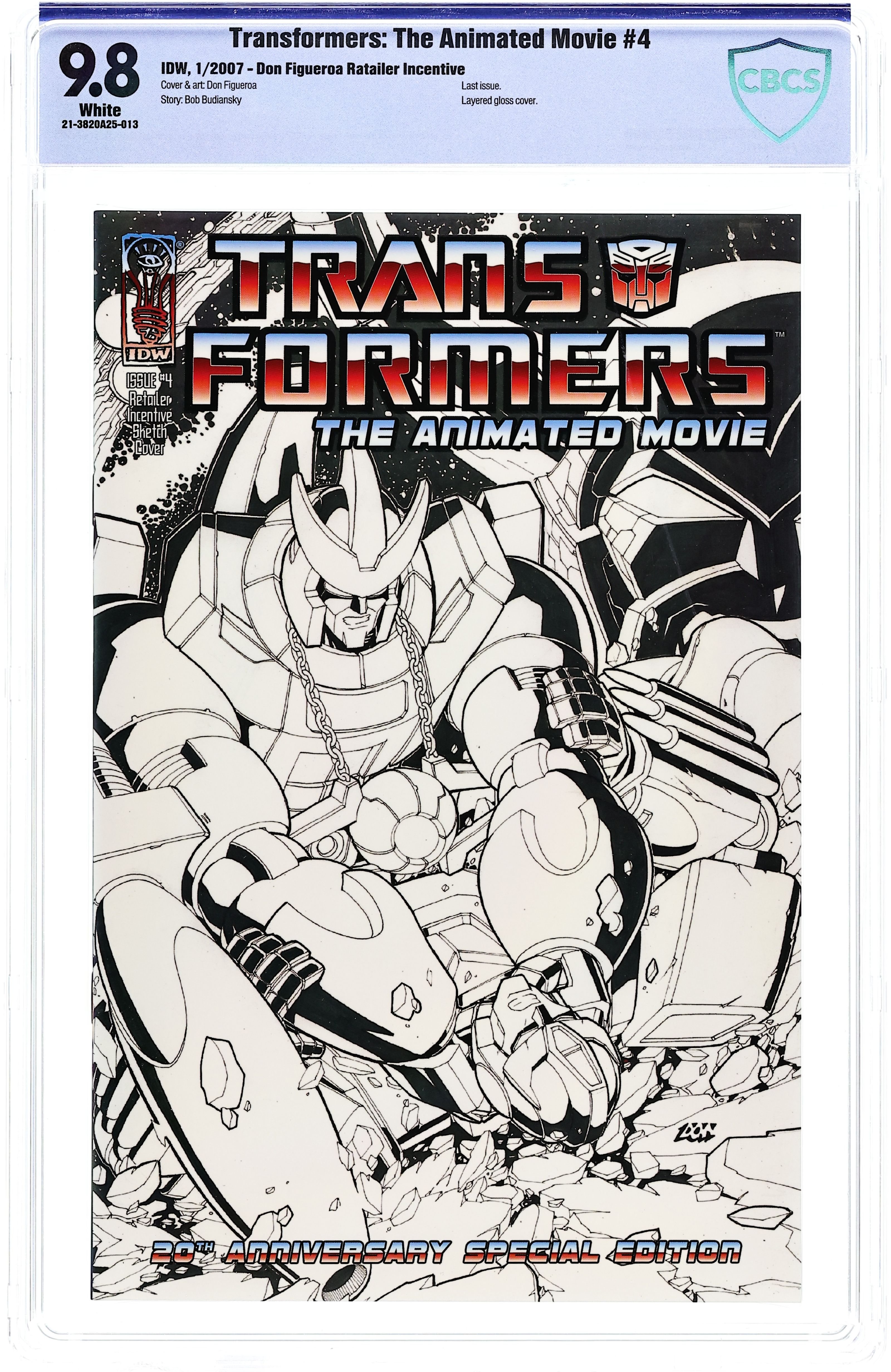 Retailer Incentive Sketch Cover. 20th Anniversary Celebration! The world-shattering conclusion of the 4-part adaptation of the classic 1986 TRANSFORMERS movie! Unicron sets out to destroy the Transformers' home planet Cybertron-and only the power of the Matrix can stop him! Written by long-time GenOne scribe Bob Budiansky and illustrated by Trans fan-fave artist, Don Figueroa. *Retailers: See your order form for a special incentive Cover price $3.99.