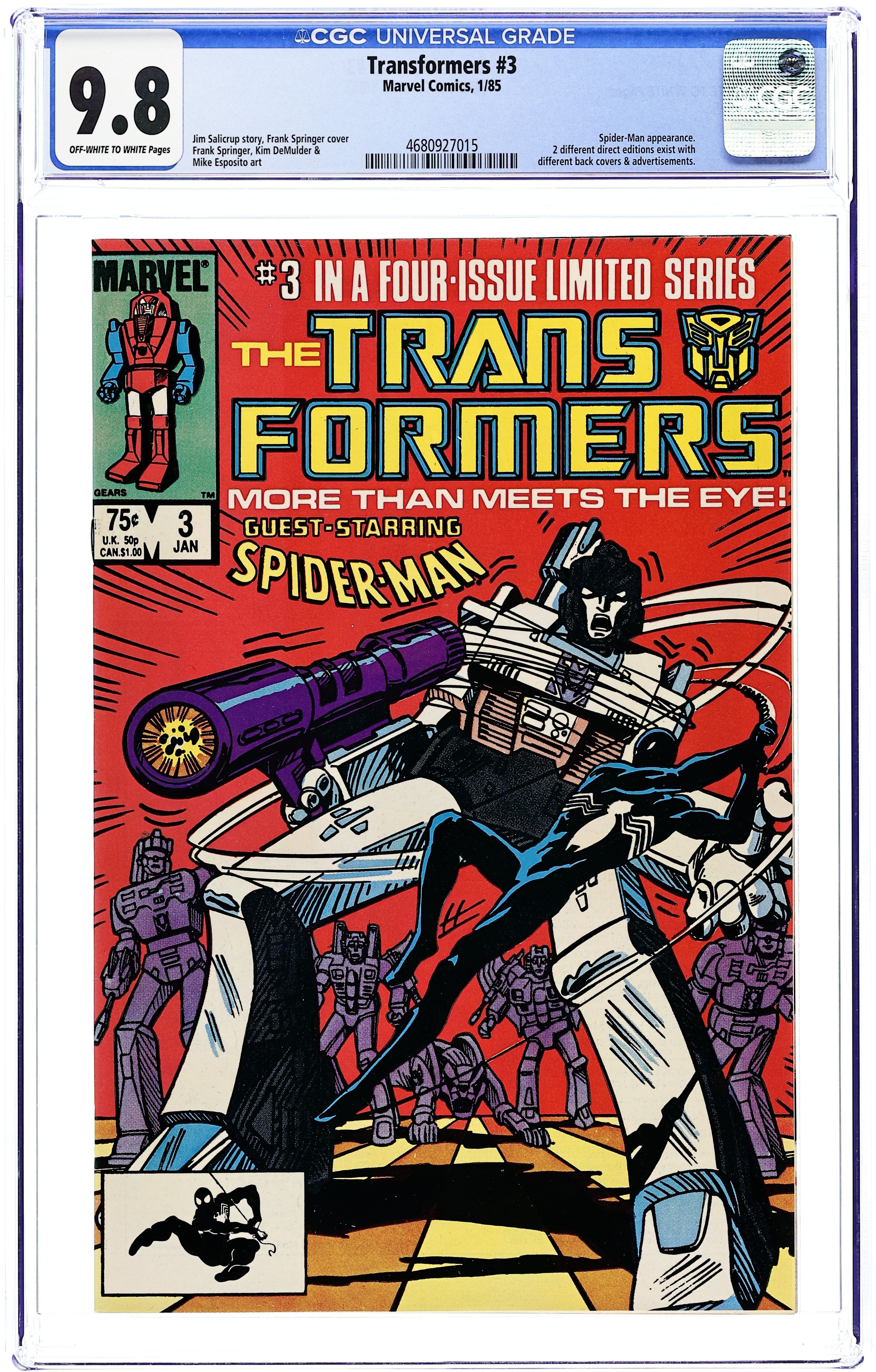 Starts Apr 4 First Printing. Direct Edition. "Prisoner of War!" Part 3 of 4. Guest-starring the Amazing Spider-Man. Nick Fury cameo. Story by Jim Salicrup. Art by Frank Springer, Kim DeMulder and Mike Esposito. Cover by Mark Texeira. The Decepticons have taken control of a nuclear power plant. Now, with the world watching, the Autobots must stop their malevolent counterparts before it's too late. At least they'll get a little help from everyone's favorite Friendly Neighborhood Spider-Man. This is a first printing. All 2nd or 3rd printings have a 2nd, 3rd printing notice on inside at bottom of indicia on first/splash page. 2nd printings were done for most issues from #1 to #9. Cover price $0.75.