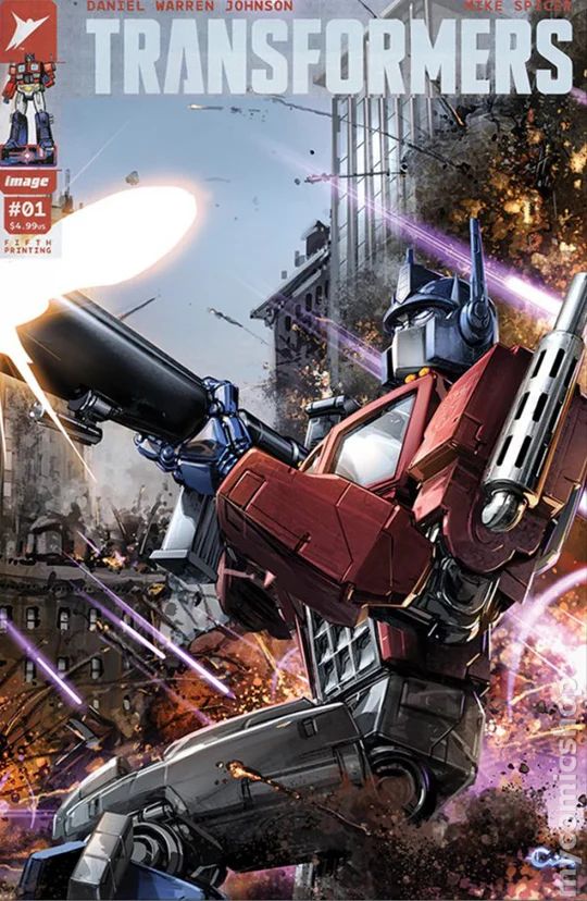 Written by Daniel Warren Johnson. Art by Mike Spicer, Daniel Warren Johnson. Cover by Daniel Warren Johnson, Mike Spicer. SERIES PREMIERE THE ALL NEW TRANSFORMERS ERA STARTS HERE! Superstar creator DANIEL WARREN JOHNSON (DO A POWERBOMB, Wonder Woman: Dead Earth), alongside ENERGON UNIVERSE showrunner ROBERT KIRKMAN (VOID RIVALS, INVINCIBLE), reimagines Hasbro's robots in disguise for a brand-new generation. Optimus Prime was supposed to have led the Autobots to victory. Instead, the fate of Cybertron is unknown, and his allies have crash-landed far from home, alongside their enemies-the Decepticons. As these titanic forces renew their war on Earth, one thing is immediately clear: the planet will never be the same. New alliances are struck. Battle lines are redrawn. And humanity's only hope of survival is Optimus Prime. Discover THE TRANSFORMERS like you've never seen them before! 36 pages, full color. Rated T Cover price $4.99.