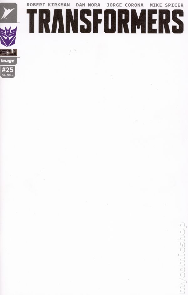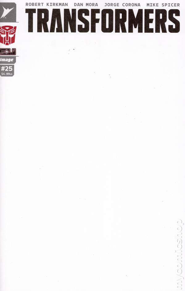 (W) Robert Kirkman (A) Dan Mora, Jorge Corona, Mike Spicer (CA) Blank Sketch NEW ARC ROBERT KIRKMAN AND DAN MORA START A NEW ERA WITH AN OVERSIZED ANNIVERSARY ISSUE! The Energon Universe will never be the same as the Autobots and Decepticons kick off the most surprising new chapter in their war on Earth. Optimus Prime and the remaining Autobots must join forces with unlikely allies in order to protect their adopted planet. But Primes next challenge lies closer to home than he ever imagined. And what is the fate of the Decepticons? The creative dream team of Robert Kirkman (Invincible, The Walking Dead) and Dan Mora (Justice League Unlimited, Superman) kick off the new direction for TRANSFORMERS that will be More Than Meets The Eye! Full color, 32 pages, rated T/Teen Cover price $4.99.