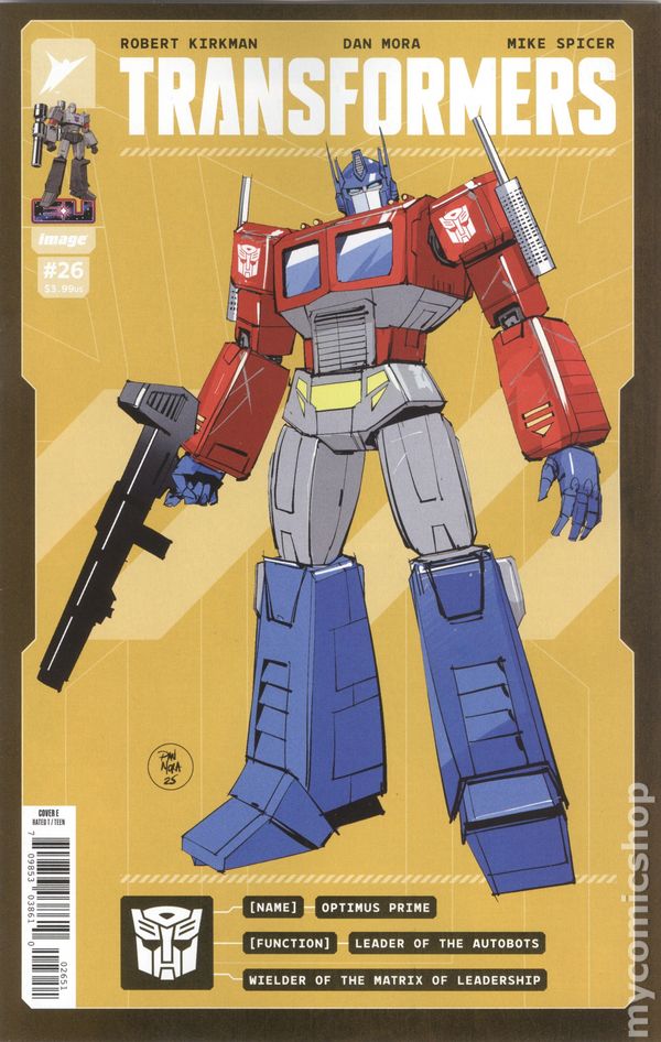 (W) Robert Kirkman (A) Dan Mora, Mike Spicer (CA) Jorge Corona, Mike Spicer ROBERT KIRKMAN AND DAN MORA SHAKE UP THE ENERGON UNIVERSE!Optimus Prime…betrayed?The Autobots newest hope may turn out to be their downfall.The most shocking TRANSFORMERS story continues here! 32 pages, full color, rated teen. Cover price $3.99.