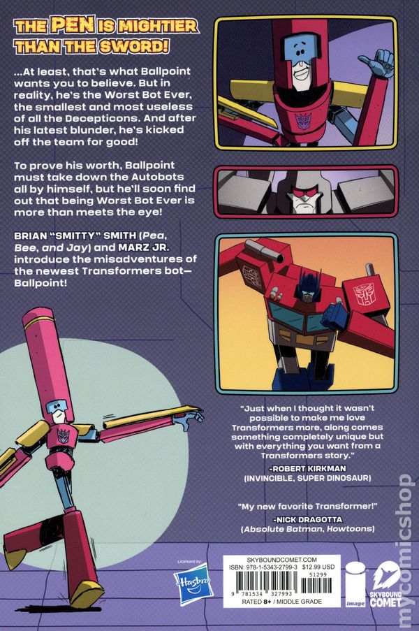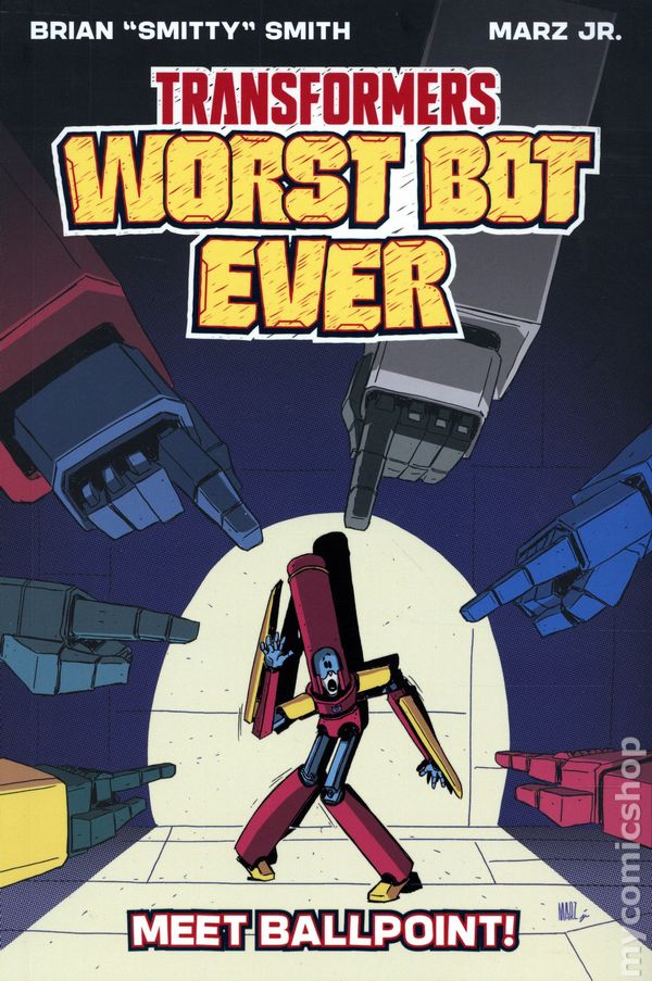 1st printing. Written by Brian Smitty Smith. Art and cover by Marz Jr. The Decepticons are known for being bad...but Ballpoint is truly the _worst—_the biggest failure of them all. After the latest attempt to take down the Autobots goes horribly wrong, hes kicked out of the Decepticons, for good! Will Ballpoint be able to prove his worth by defeating the Autobots all by himself? Or will he keep failing and find that being the best is More than Meets the Eye? BRIAN SMITTY SMITH (Pea, Bee, and Jay) and MARZ JR. introduce middle-grade readers to the misadventures of the bot who is mightier than the sword in TRANSFORMERS: WORST BOT EVER—MEET BALLPOINT. Softcover, 6-in. x 9-in., 112 pages, full color. Cover price $12.99.