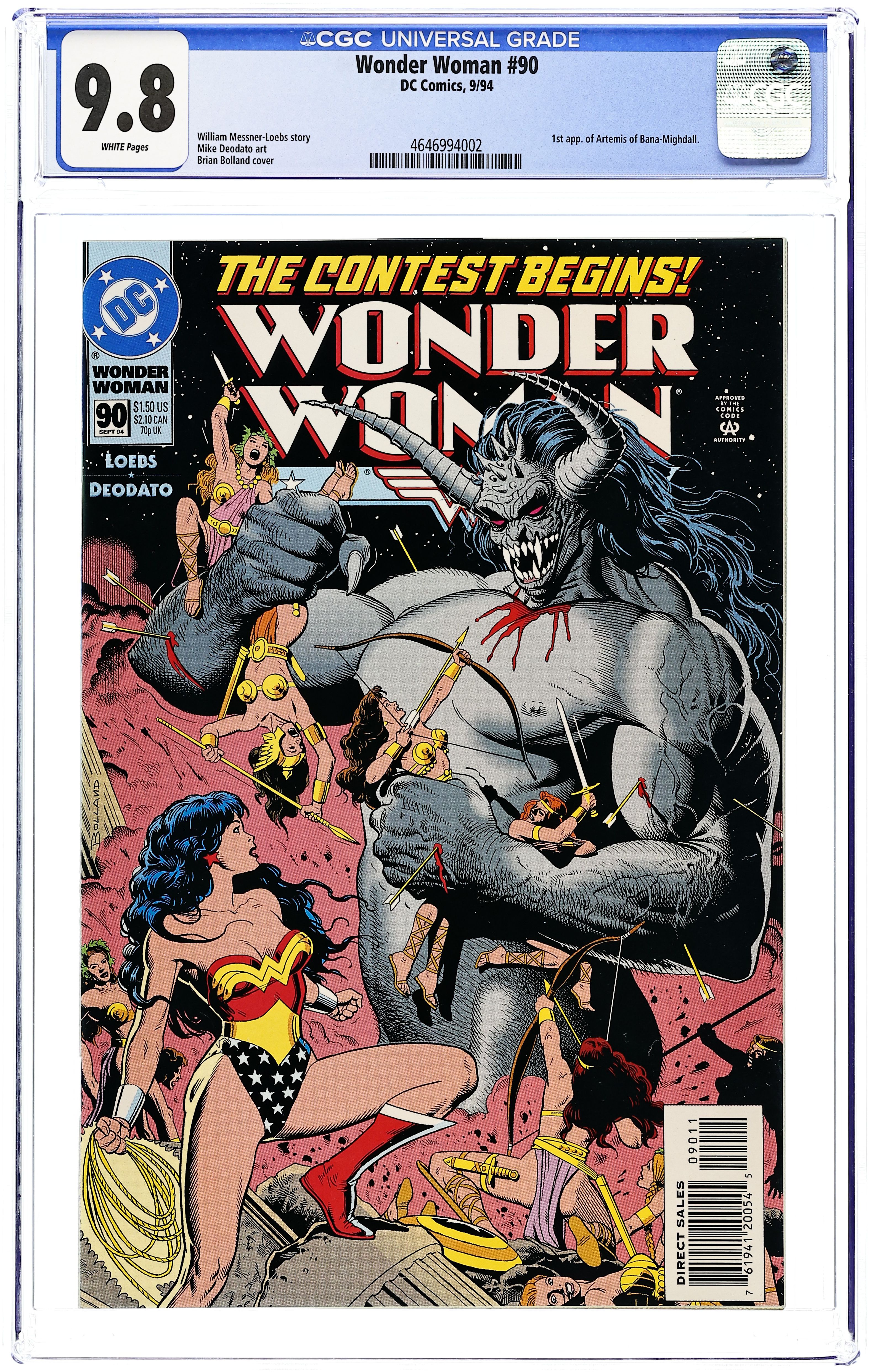 Starts Feb 2 The Contest: Part 1 of 5: Homeward Gazings - Written by William Messner-Loebs. Art by Mike Deodato. Cover by Brian Bolland. It's catch-up time, as the Amazons recount their battle against a demon invasion, and Diana defends her recent drastic actions to her mother -- prompting the Queen to call for another Contest! First appearance of Artemis. Continued in Wonder Woman (1987-2006 2nd Series) #0. 36 pages, full color. Cover price $1.50.