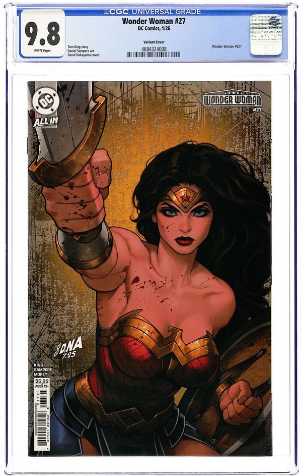 Written by Tom King. Art by Daniel Sampere. Cover by David Nakayama. DIANA'S BLOODY WAR WITH THE SOVEREIGN REACHES AN EPIC CONCLUSION! The Sovereign took away Wonder Woman's world, and now she has taken away his. As their war reaches its end, the two icons prepare for battle. Who will emerge victorious? Find out as Diana's quest for peace comes to a bloody end! 32 pages, full color. Rated T+ Cover price $5.99.