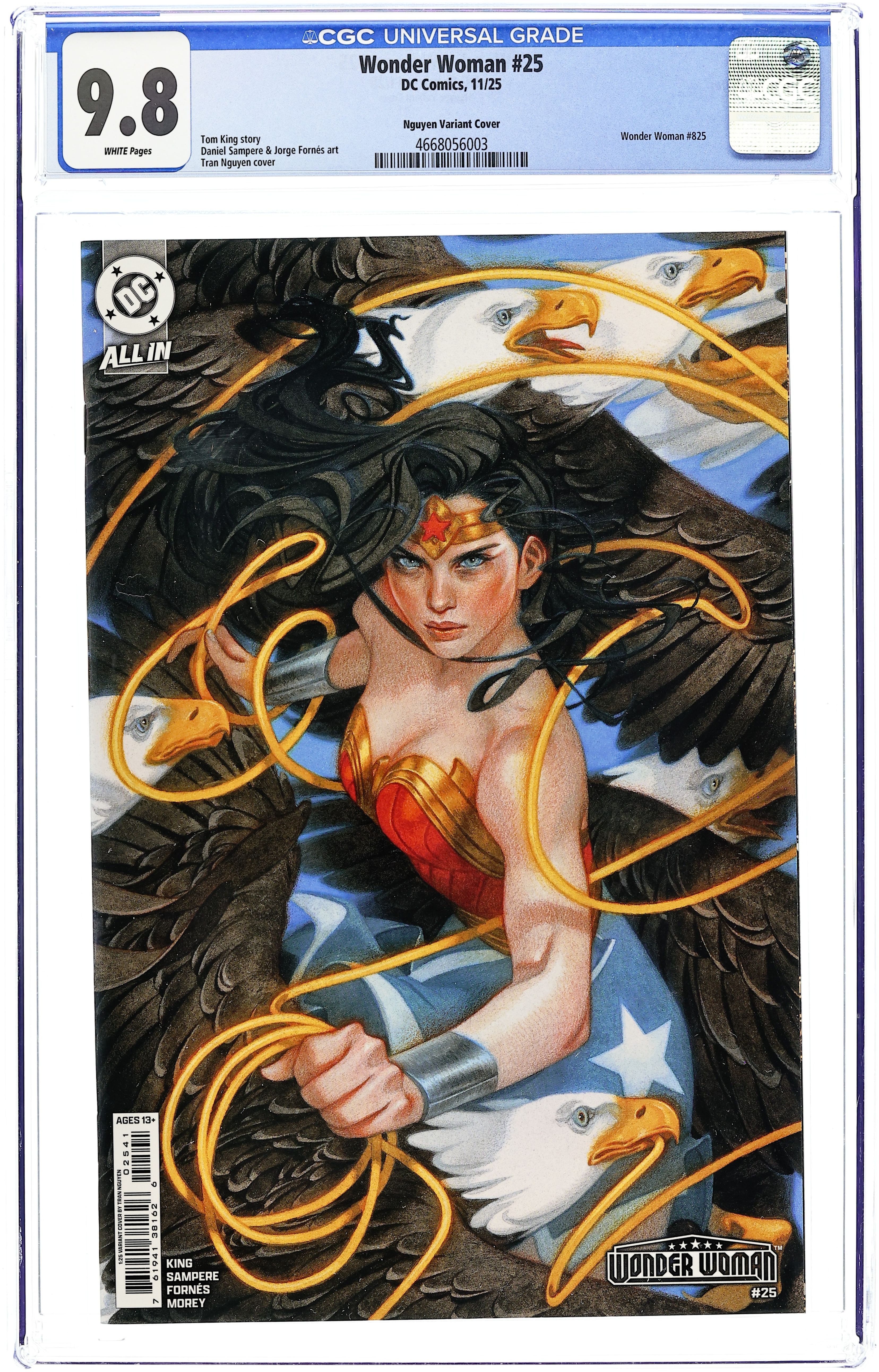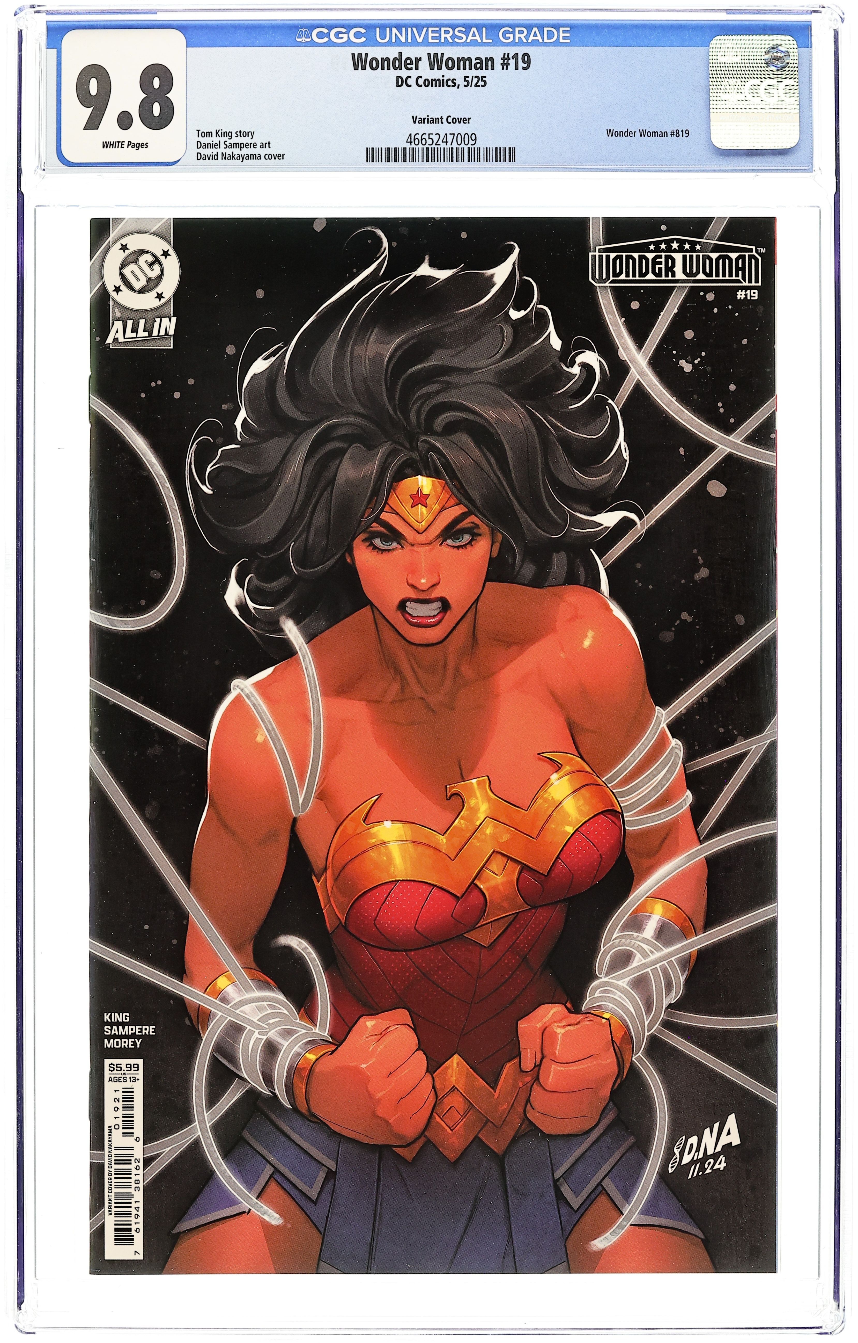 Exclusive Trade Dress Variant Cover by Ariel Diaz. Written by Tom King. Art by Daniel Sampere. THE AMAZON WARRIOR IS NOW A WANTED OUTLAW! A NEW ERA FOR THE AMAZON WARRIOR BEGINS, FROM THE SUPERSTAR TEAM OF TOM KING AND DANIEL SAMPERE! After a mysterious Amazonian is accused of mass murder, Congress passes the Amazon Safety Act, barring all Amazons from U.S. soil. To carry out their plans, the government starts a task force, the Amazon Extradition Entity (A.X.E.), to remove those who don't comply, by any means necessary. Now, in her search for the truth behind the killing, Wonder Woman finds herself an outlaw in the world she once swore to protect! Writer Tom King (Batman, Mister Miracle, Supergirl: Woman of Tomorrow) and superstar artist in the making Daniel Sampere (Dark Crisis, Action Comics) join forces for this action-packed relaunch and the beginning of what will undoubtedly become a groundbreaking run on the character. 40 pages, full color. Rated T+