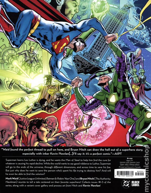 1st printing. Collects Superman: The Last Days of Lex Luthor (2023 DC) #1-3. Written by Mark Waid. Art by Bryan Hitch and Kevin Nowlan. Cover by Bryan Hitch. Mark Waid and Bryan Hitch reunite to tell a tale centered on their favorite super-hero. Superman learns Lex Luthor is dying, and he wants the Man of Steel to help him find the cure for whatever is causing his rapid decline. While the world wants to say good riddance to Luthor, Superman will go to the ends of the universe, through different dimensions, and across time to save his foe. But just why does he want to save the person who's spent his life trying to destroy him? And will he even be able to find the solution? Hardcover, 168 pages, full color. Teen Cover price $29.99.