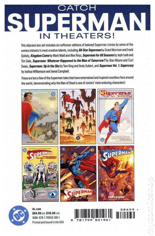 Set Includes 6 Volumes (with Slipcase) - Printings May Vary. Written by Grant Morrison, Jeph Loeb, Alan Moore, Mark Waid, Tom King, and Joshua Williamson. Art by Frank Quietly, Tim Sale, Curt Swan, Alex Ross, Andy Kubert, and Jamal Campbell. SIX OF THE MAN OF STEEL'S GREATEST TALES! This slipcase box set includes six softcover editions of beloved Superman stories by some of the comics industry's most creative talents, including All-Star Superman by Grant Morrison and Frank Quitely, Kingdom Come by Mark Waid and Alex Ross, Superman for All Seasons by Jeph Loeb and Tim Sale, Superman: Whatever Happened to the Man of Tomorrow? by Alan Moore and Curt Swan, Superman: Up in the Sky by Tom King and Andy Kubert, and Superman Vol. 1: Supercorp by Joshua Williamson and Jamal Campbell. Take these adventures home with you and catch Superman in theaters! Softcover (6 Volumes with Slipcase), 808 pages (Total), full color. Cover price $84.99.