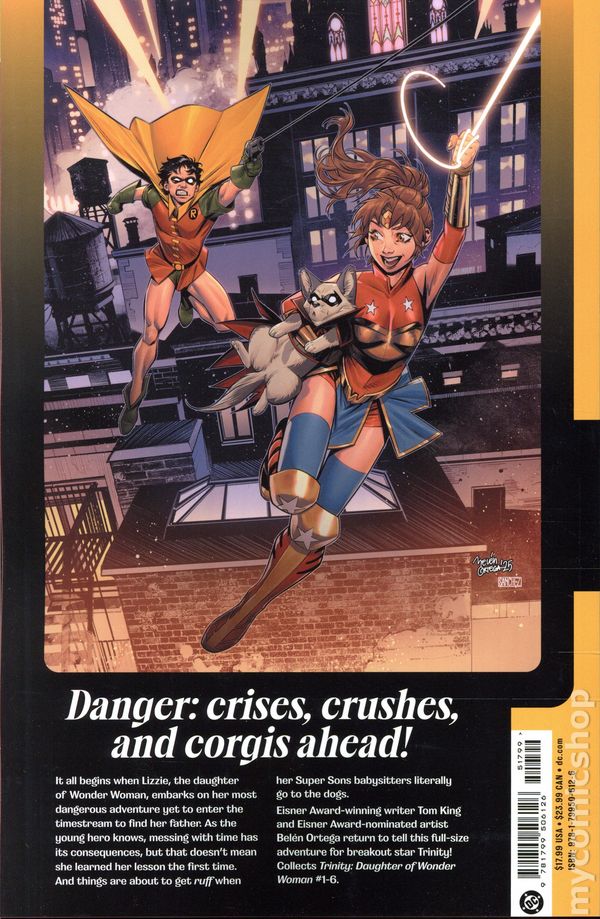 1st printing. Collects Trinity: Daughter of Wonder Woman (2025 DC) #1-6. Written by Tom King. Art and Cover by Belen Ortega. DANGER: CRISES, CRUSHES, AND CORGIS AHEAD! It all begins when Lizzie, the daughter of Wonder Woman, embarks on her most dangerous adventure yet to enter the time stream to find her father. As the young hero knows, messing with time has its consequences, but that doesn't mean she learned her lesson the first time. And things are about to get ruff when her Super Sons babysitters literally go to the dogs. Eisner Award-winning writer Tom King and Eisner Award-nominated artist Belen Ortega return to tell this full-size adventure for breakout star Trinity! Softcover, 168 pages, full color. Teen Cover price $17.99.