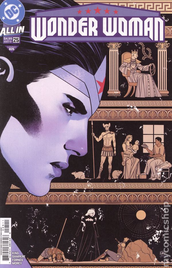 Foil Cover. Written by Tom King. Art by Daniel Sampere and Jorge Fornes. Cover by David Nakayama. THE MATRIARCH RISES! After days of searching through a mouse-infested world, Wonder Woman finally locates the lost Etta Candy and fugitive Amazon Emilie. Little does she know, they are hiding a tiny harbinger of death who will change Diana's fate forever! You won't want to miss the first appearance of the Matriarch in this oversize anniversary issue that will set the stage for all Wonder Woman stories to come! 36 pgs, FC, T. Cover price $7.99.