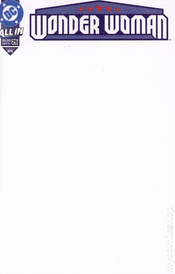 Written by Tom King. Art by Daniel Sampere and Jorge Fornes. Blank Cover. THE MATRIARCH RISES! After days of searching through a mouse-infested world, Wonder Woman finally locates the lost Etta Candy and fugitive Amazon Emilie. Little does she know, they are hiding a tiny harbinger of death who will change Diana's fate forever! You won't want to miss the first appearance of the Matriarch in this oversize anniversary issue that will set the stage for all Wonder Woman stories to come! 36 pgs, FC, T. Cover price $5.99.
