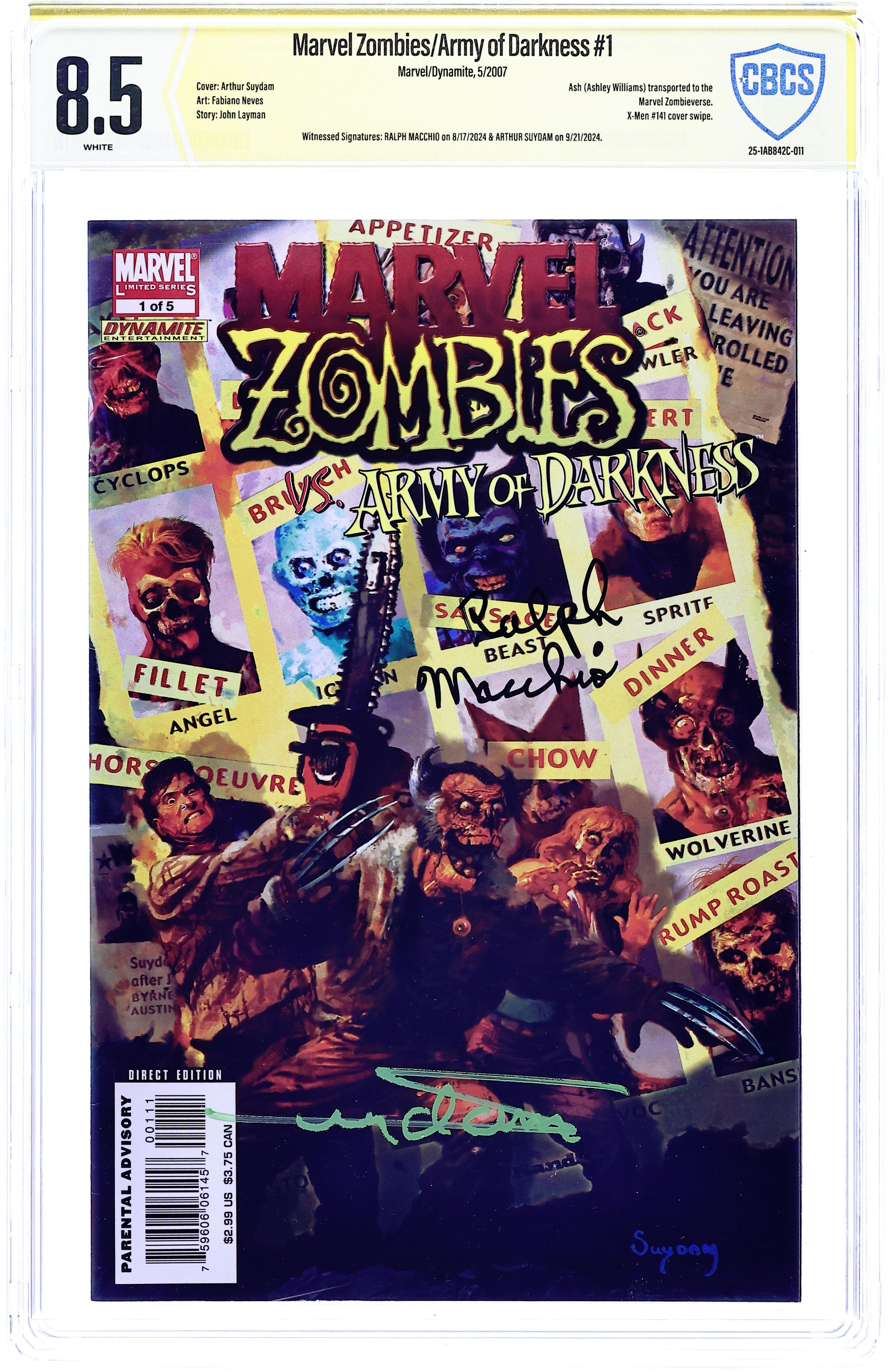 First printing. Written by John Layman. Art by Fabiano Neves & June Chung. Cover by Arthur Suydam. This is it true believers, the cross-over of the century begins here! The Marvel Zombies come face-to-face with Dynamite Entertainment's Ash from the Army of Darkness! Ash has faced legions of the undead before, but never like this...as he lands in the heart of New York just as the Zombie outbreak begins! See how his actions help turn more heroes and villains into Zombies! Under the watchful eye of Marvel Zombie guru Robert Kirkman, this might just be the comic event of 2007! Plus: The entire series will feature classic 'homage' covers from painter Arthur Suydam! 32 Pages, full color. Cover price $2.99.