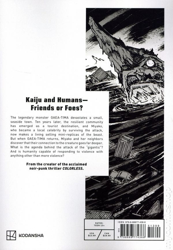 Volume 1 - 1st printing. Story and art by Kent. A monster that people call GAEA-TIMA devastates a small, seaside town. Ten years later, the resilient community has emerged as a tourist destination, and Miyako, who became a local celebrity by surviving the attack, is making a living selling mini-replicas of the beast. But when GAEA-TIMA returns, Miyako and her neighbors will discover that their enduring connection to the creature goes deeper than tourism and trauma. Just what is the true agenda behind the attack of the "gigantis?" Are there more like GAEA-TIMA waiting for their moment? And is humanity capable of responding to violence with anything other than more violence? Softcover, 5 3/4-in. x 8 1/4-in., 192 pages, B&W. Rated T (13+) Cover price $13.99.