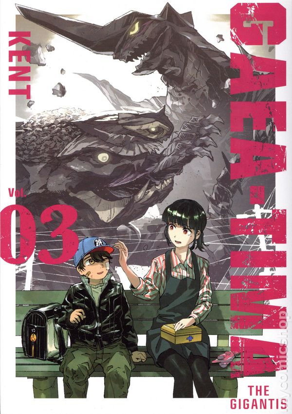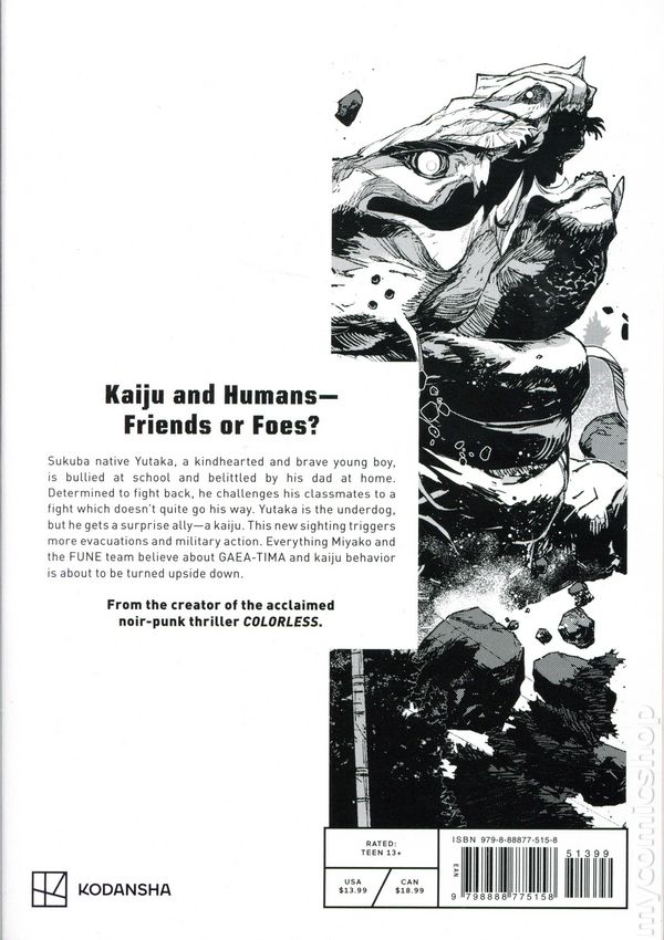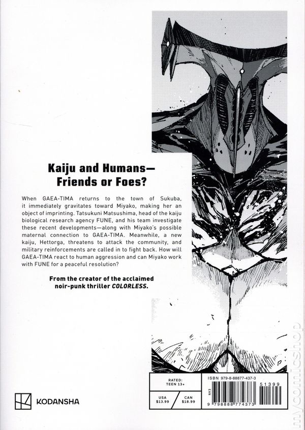 Volume 3 - 1st printing. Story and art by Kent. A gigantic monster returns to the town it ravaged years earlier in this poignant kaiju manga from the creator of the hit series Colorless. In the spirit of the classic Godzilla and Godzilla Minus One, GAEA-TIMA combines thunderous action and character drama with the social conscience and thematic complexity of the genre's post-war roots. Kaiju and Humans—Friends or Foes? Sukuba native Yutaka, a kindhearted and brave young boy, is bullied at school and belittled by his dad at home. Determined to fight back, he challenges his classmates to a fight which doesnt quite go his way. Yutaka is the underdog, but he gets a surprise ally—a kaiju. This new sighting triggers more evacuations and military action. Everything Miyako and the FUNE team believe about GAEA-TIMA and kaiju behavior is about to be turned upside down. Softcover, 5 3/4-in. x 8 1/4-in., 160 pages, B&W. Rated T (13+) Cover price $13.99.