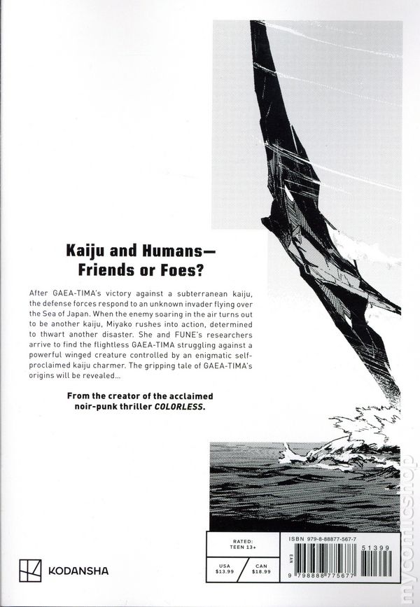 Volume 4 - 1st printing. Story and art by Kent. A gigantic monster returns to the town it ravaged years earlier in this poignant kaiju manga from the creator of the hit series Colorless. In the spirit of the classic Godzilla and Godzilla Minus One, GAEA-TIMA combines thunderous action and character drama with the social conscience and thematic complexity of the genre's post-war roots. After GAEA-TIMAs victory against a subterranean kaiju, the defense forces respond to an unknown invader flying over the Sea of Japan. When the enemy soaring in the air turns out to be another kaiju, Miyako rushes into action, determined to thwart another disaster. She and FUNEs researchers arrive to find the flightless GAEA-TIMA struggling against a powerful winged creature controlled by an enigmatic self-proclaimed kaiju charmer. The gripping tale of GAEA-TIMAs origins will be revealed… Softcover, 5 3/4-in. x 8 1/4-in., 160 pages, B&W. Rated T (13+) Cover price $13.99.