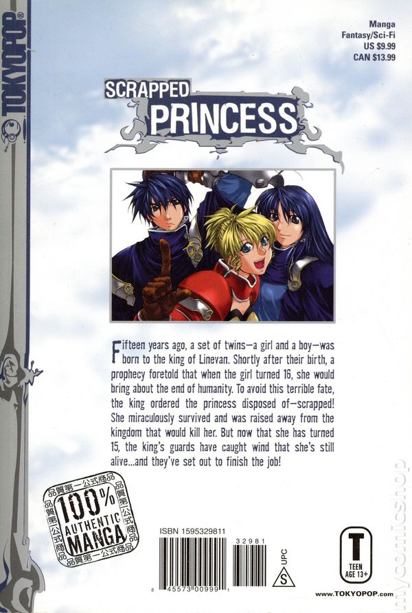 Volume 1 - 1st printing. Written by Ichiro Sakaki. Art and Cover by Go Yabuki. Original Character Designs by Yukinobu Azumi. Fifteen years ago, a set of twins - a girl and a boy - was born to the king of Linevan. Shortly after their birth, a prophecy foretold that when the girl turned 16, she would bring about the end of humanity. To avoid this terrible fate, the king ordered the princess disposed of, scrapped! She miraculously survived and was raised away from the kingdom that would kill her. But now she has turned 15, the king's guards have caught wind that she's still alive...and they set out to finish the job! Softcover, 192 pages, 5-in x 7-in. B&W. Teen Cover price $9.99.