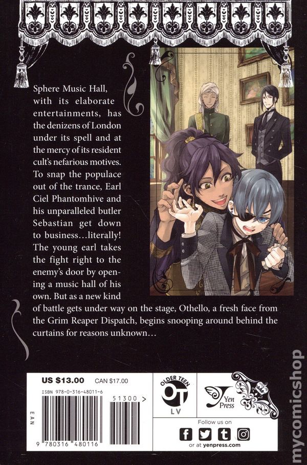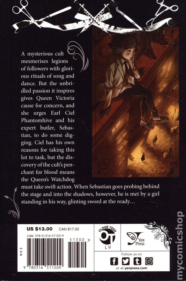 A #1 New York Times bestseller! The butler of Phantomhive manor is simply too good to be true...or perhaps he's just too good to be human... A mysterious cult mesmerises legions of spectators with glorious rituals of song and dance. But the unbridled passion it inspires in its followers gives Queen Victoria cause for concern, and she urges Earl Ciel Phantomhive and his expert butler, Sebastian, to do some digging. Ciel has his own reasons for taking this lot to task, but the discovery of the cult's penchant for blood means the Queen's watchdog must make an immediate move. And when Sebastian goes probing behind the stages and into the shadows, he's met by a girl standing in his way, her sword ready to meet him head on...
