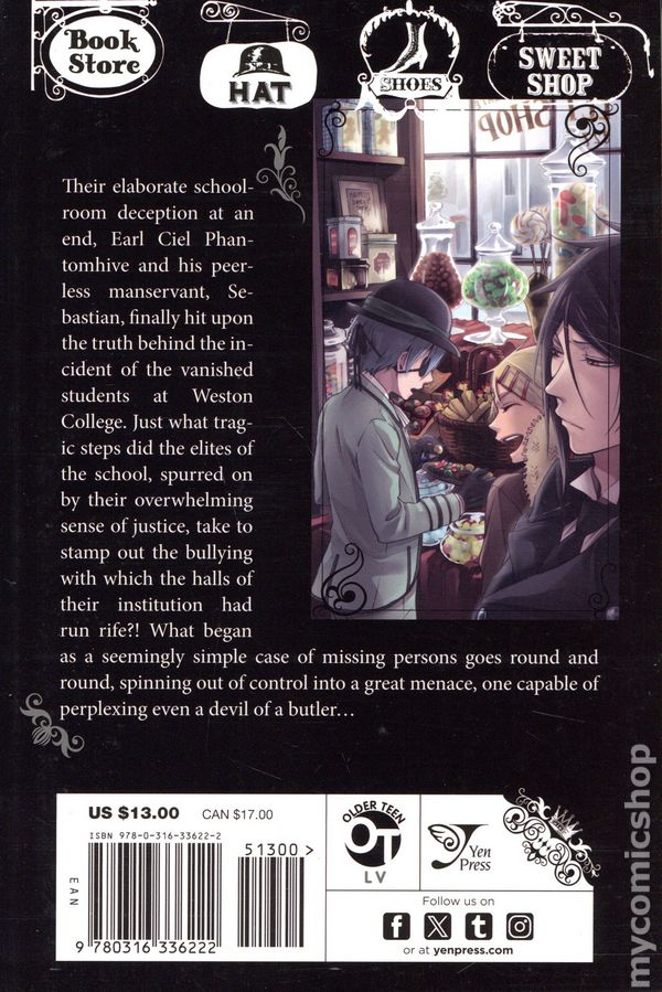 Their elaborate schoolroom deception at an end, Earl Ciel Phantomhive and his peerless manservant, Sebastian, finally hit upon the truth behind the incident of the vanished students at Weston College. Just what tragic steps did the elites of the school, spurred on by their overwhelming sense of justice, take to stamp out the bullying running rife in the halls of their institution? What began as a seemingly simple case of missing persons goes round and round, spinning out of control into a great menace, one capable of perplexing even a devil!