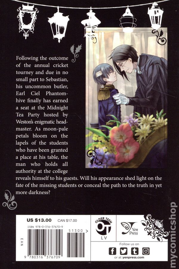 A #1 New York Times bestseller! The butler of Phantomhive manor is simply too good to be true...or perhaps he's just too good to be human... Earl Ciel Phantomhive and his invincible butler Sebastian may have succeeded in sneaking their way into the elite Weston College, but their investigation quickly hits a wall. To earn an audience with the headmaster, Ciel's only option is to attend the "Midnight Tea Party," an exclusive gathering hosted by the elusive head of the school. And the only way a lowly first-former like Ciel, earl or no, can land a seat at that table is by being elected the Most Valuable Player in the College's annual storied cricket tournament. Selected from each house, students in the springtime of youth battle it out among the wickets on the spring-green lawn. Will the usually unperturbed young earl be bowled over by this unexpected turn of events?!
