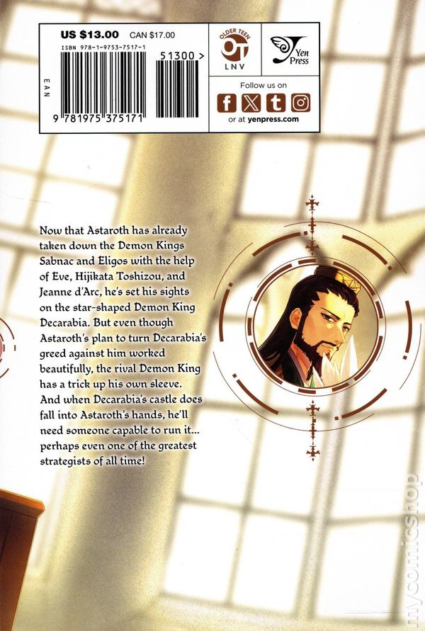 Volume 6 - 1st printing. Written by Ryosuke Hata. Art and cover by Manatsu Suzuki. Character Design by Yuugen and Yuu Hitaki. Translated by Andria McKnight. In a chaotic world dominated by seventy-two Demon Kings, he was reborn as the seventy-second Demon King-Astaroth. A goddess suddenly appeared before him in his confusion, instructing him to become the Supreme Demon King and reform the world. After taking down the Demon Kings Sabnac and Eligos with the help of Eve, Hijikata Toshizou, and Jeanne d'Arc, Astaroth has set his sights on the star-shaped Demon King Decarabia. But even though Astaroth has cleverly used economics to back Decarabia into a corner, could the rival Demon King have a trick up his own sleeve? Softcover, 5-in. x 7-in., 160 pages, B&W. Older Teen Cover price $13.00.