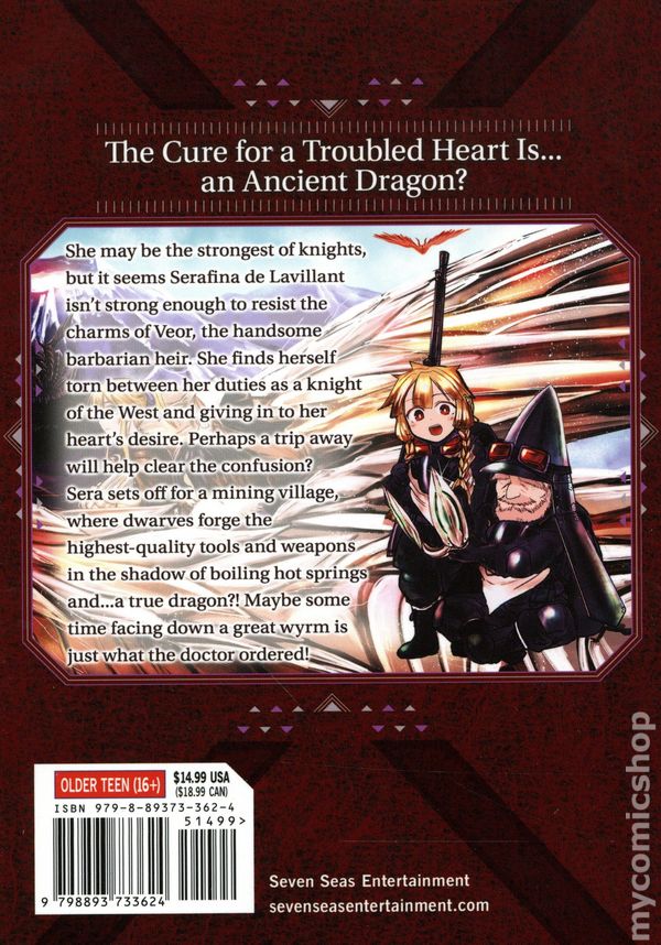 Volume 4 - 1st printing. Story and art by Noriaki Kotaba. Translated by Ella Donaldson. She may be the strongest of knights, but it seems Serafina de Lavillant isn't strong enough to resist the charms of Veor, the handsome barbarian heir. She finds herself torn between her duties as a knight of the West and giving in to her heart's desire. Perhaps a trip away will help clear the confusion? Sera sets off for a mining village, where dwarves forge the highest-quality tools and weapons in the shadow of boiling hot springs and... a true dragon?! Maybe some time facing down a great wyrm is just what the doctor ordered! Softcover, 5-in. x 7-in., 200 pages, B&W. Older Teen (15+) Cover price $14.99.