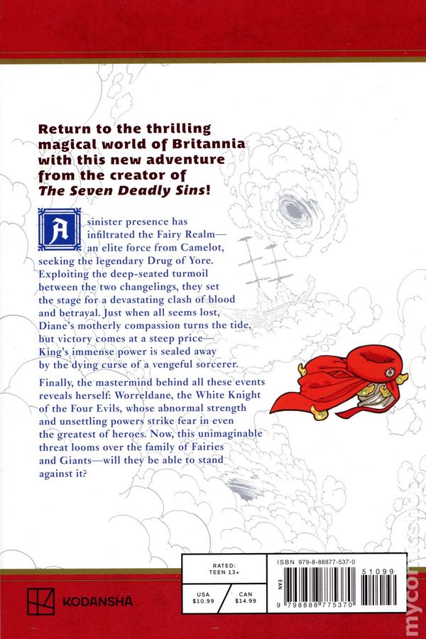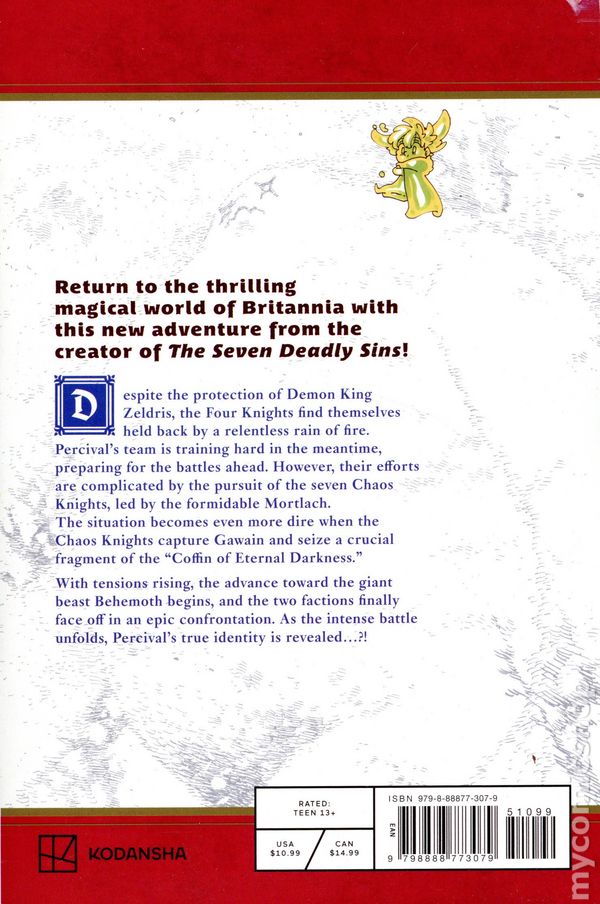 Volume 5 - 1st printing. Story and art by Nakaba Suzuki. Translated by Kevin Steinach. Return to the magical and thrilling world of Britannia with this new adventure from the creator of The Seven Deadly Sins, the manga that inspired the No. 1 hit Netflix Original Anime! With the help of Captain Howzer, Percival and his friends have stopped the rampaging dragon in Cant. Now its time to cross the dangerous Dalflare Mountain Range to reach Liones. But before long, the party is separated! When Percival and Donny rush to investigate a village and Sin the fox follows them in concern, Anne and Nasiens are held back by a man who warns them that the place is a den of monsters! Will Anne and Nasiens see their friends again, or is it already too late...? Softcover, 5-in. x 7-in., 192 pages, B&W. Teen (13+) Cover price $10.99.
