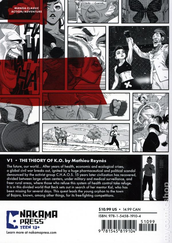 Volume 1 - 1st printing. Story and art by Mathieu Reynes. Translated by Book Buddy Media. The future, our world... After years of health, economic and ecological crises, a global civil war breaks out, ignited by a huge pharmaceutical and political scandal denounced by the activist group C.H.A.O.S. 15 years later civilization has recovered, divided between large urban centers, under military and medical surveillance, and freer rural areas, where those who refuse this system of health control take refuge. It is in this divided world that Beck sets out in search of her mentor Kal, who has been missing for several days. This quest leads the young orphan to the town of Bajara, known, among other things, for its free-fighting competitions. Softcover, 5-in. x 7-in., 192 pages, B&W. Young Adult Cover price $10.99.