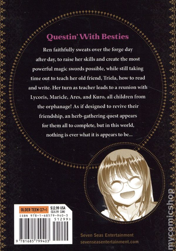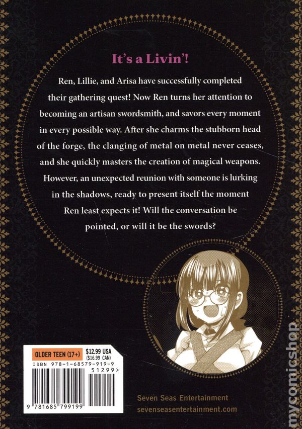 Volume 8 - 1st printing. Story and art by Ashi. Translated by Jshua Hardy. Adapted by Solo Mia. Ren, Lillie, and Arisa have successfully completed their gathering quest! Now Ren turns her attention to becoming an artisan swordsmith, and savors every moment in every possible way. After she charms the stubborn head of the forge, the clanging of metal on metal never ceases, and she quickly masters the creation of magical weapons. However, an unexpected reunion with someone is lurking in the shadows, ready to present itself the moment Ren least expects it! Will the conversation be pointed, or will it be the swords? Softcover, 5-in. x 7-in., 160 pages, B&W. Older Teen 17+ Cover price $12.99.