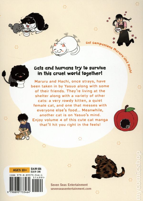 Volume 4 - 1st printing. Story and art by Yuri Sonoda. Translated by Michelle Tymon. Maruru and Hachi, once strays, have been taken in by Yasuo along with some of their friends. They're living at the shelter along with a variety of other cats: a very rowdy kitten, a quiet female cat, and one that messes with everyone else's food... Meanwhile, another cat is on Yasuo's mind. Softcover, 6-in. x 8 1/4-in., 160 pages, B&W. Ages 10+ Cover price $14.99.