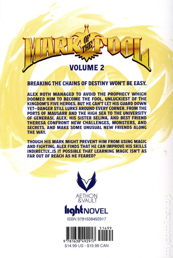 Volume 2 - 1st printing. Written by J.M. Clarke. Art and cover by Natsujirushi. Breaking the chains of destiny wont be easy. Alex Roth managed to avoid the prophecy which doomed him to become The Fool, unluckiest of the kingdoms five Heroes. But he cant let his guard down yet–danger still lurks around every corner. From the Ports of Mausarr and the high sea to the University of Generasi, Alex, his sister Selina, and best friend Theresa confront new challenges, monsters, and secrets, and make some unusual new friends. Though his Mark might prevent him from learning magic and fighting, Alex learns that he can use it to improve his skills indirectly. Is it possible that learning magic isnt as far out of reach as he feared? Softcover, 5 1/2-in. x 8-in., 256 pages, Text (with B&W Chapter Illustrations). Cover price $14.99.