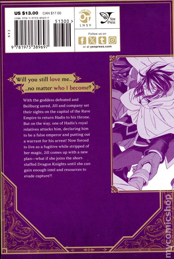 Volume 4 - 1st printing. Written by Sarasa Nagase. Art and cover by Anko Yuzu. Character Design by Mitsuya Fuji. Translated by John Neal. "Will You Still Love Me, No Matter Who I Become?!?" With the goddess defeated and Beilburg saved, Jill and company set their sights on the capital of the Rave Empire to return Hadis to his throne. But on the way, one of Hadiss royal relatives attacks him, declaring him to be a false emperor and putting out a warrant for his arrest! Now forced to live as a fugitive while stripped of her magic, Jill comes up with a new plan—what if she joins the short-staffed Dragon Knights until she can gain enough intel and resources to evade capture?!! Softcover, 5-in. x 7-in., 160 pages, B&W. Cover price $13.00.