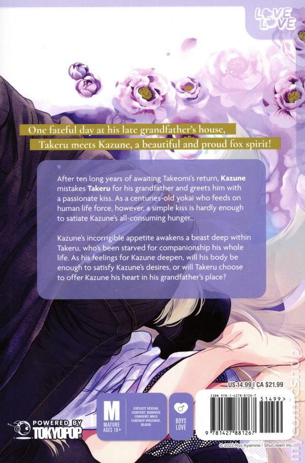 1st printing. Story and art by Ryo Ayamine. Translated by Dylan Jekels. At his late grandfather's house, Ken meets Kazune, a "fox spirit" who claims to have known his grandfather. Ken, who has had a strong spiritual power since he was a child, is kissed as soon as they meet, and Kazune takes a liking to his "spiritual power" that resembles his grandfather's. Kazune, who is lonely but acts tough, and who is stubborn, melts sweetly once they kiss, and begs for "more," and before he knows it, he has already stolen his heart. As time passes, Ken's beast-like desires accelerate, but there is a wall that must be overcome in order for humans and spirits to live together. Softcover, 5-in. x 7-in., 216 pages, B&W. Mature Readers Cover price $14.99.