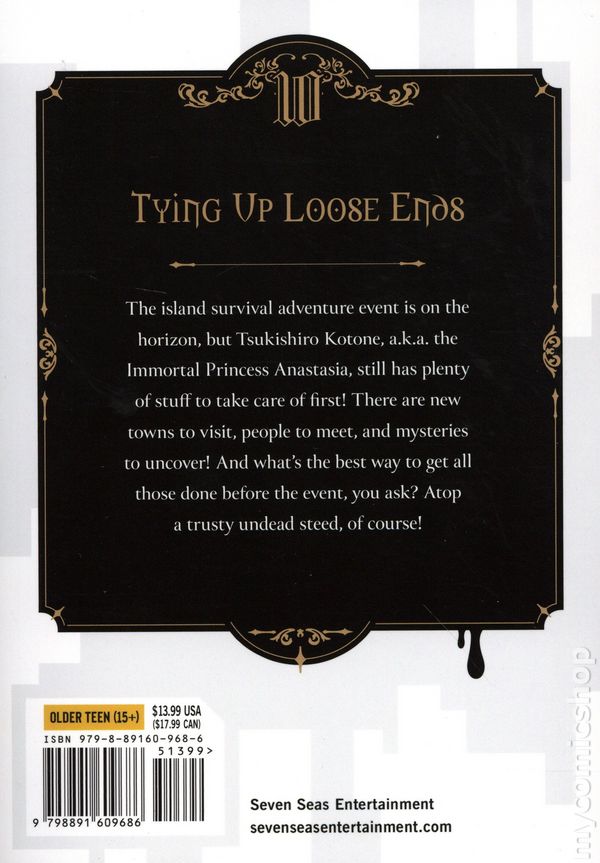 Volume 10 - 1st Printing. Written by Akisuzu Nenohi. Art by Ao Sonohara and Koma Warita. Character Design by Sherry. Adapted by Asha Bardon. Translated by Joshua Hardy. TYING UP LOOSE ENDS! The island survival adventure event is on the horizon, but Kotone Tsukishiro, a.k.a. the Immortal Princess Anastasia, still has plenty of stuff to take care of first! There are new towns to visit, people to meet, and mysteries to uncover! And what's the best way to get all those done before the event, you ask? Atop a trusty undead steed, of course!! Softcover, 5-in. x 7-in., 160 pages, B&W. Older Teen (15+) Cover price $13.99.