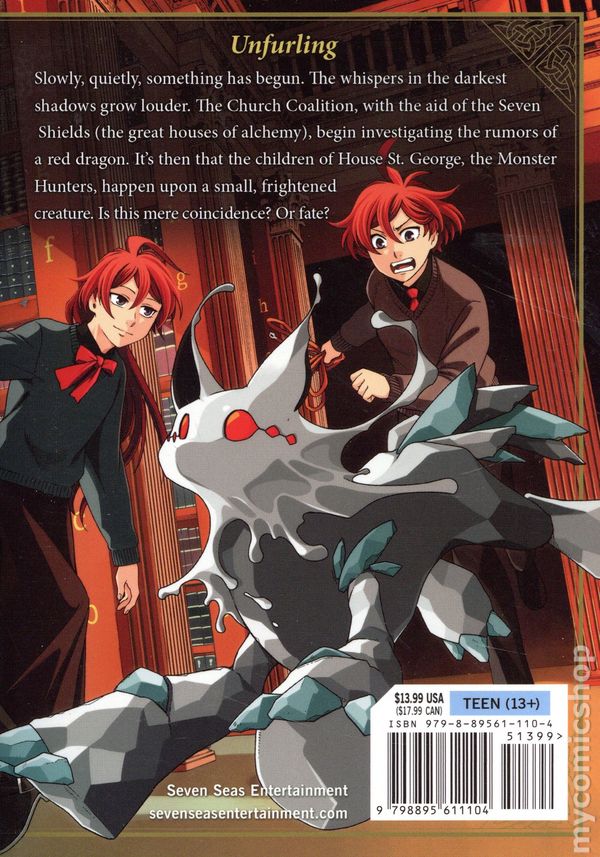 Volume 21 - 1st printing. Story and art by Kore Yamazaki. Translated by Adrienne Beck. English Adaptation by Ysabet Reinhardt MacFarlane. UNFURLING! Slowly, quietly, something has begun. The whispers in the darkest shadows grow louder. The Church Coalition, with the aid of the Seven Shields (the great houses of alchemy), begin investigating the rumors of a red dragon. Its then that the children of House St. George, the Monster Hunters, happen upon a small, frightened creature. Is this mere coincidence? Or fate? Softcover, 5 x 7-in, 176 pages, B&W. Cover price $13.99.