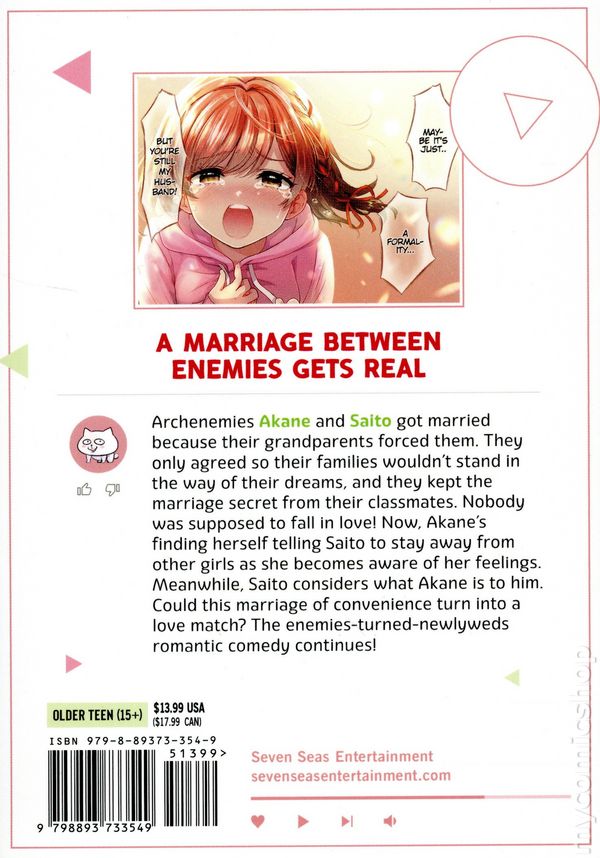 Volume 3 - 1st printing. Story and art by Koume Fujichika. Translated by Avery Hutley. Archenemies Akane and Saito got married because their grandparents forced them. They only agreed so their families wouldn't stand in the way of their dreams, and they kept the marriage secret from their classmates. Nobody was supposed to fall in love! Now, Akane's finding herself telling Saito to stay away from other girls as she becomes aware of her feelings. Meanwhile, Saito considers what Akane is to him. Could this marriage of convenience turn into a love match? The enemies-turned-newlyweds romantic comedy continues! Softcover, 5-in. x 7-in., 228 pages, B&W. Older Teen (15+) Cover price $13.99.