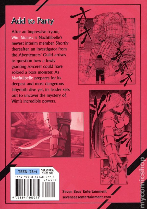 Volume 2 - 1st printing. Written by Haka Tokura and Eiri Shirai. Art and cover by Shin Arakawa. After an impressive tryout, Wim Strauss is Nachtlibelle's newest interim member. Shortly thereafter, an investigator from the Abenteurers' Guild arrives to question how a lowly granting sorcerer could have soloed a boss monster. As Nachtlibelle prepares for its deepest and most dangerous labyrinth dive yet, its leader sets out to uncover the mystery of Wim's incredible powers. Softcover, 5-in. x 7-in., 160 pages, B&W. Cover price $14.99.