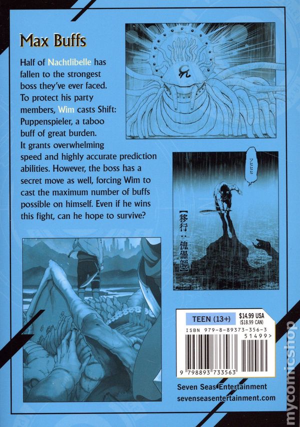 Volume 4 - 1st printing. Written by Haka Tokura and Eiri Shirai. Art and cover by Shin Arakawa. Half of Nactlibelle has fallen to the strongest boss they've ever faced. To protect his party members, Wim casts Shift: Puppenspieler, a taboo buff of great burden. It grants overwhelming speed and highly accurate prediction abilities. However, the boss has a secret move as well, forcing Wim to cast the maximum number of buffs possible on himself. Even if he wins this fight, can he hope to survive? Softcover, 5-in. x 7-in., 164 pages, B&W. Cover price $14.99.